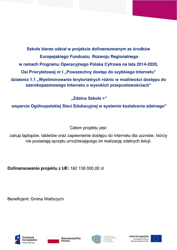 zakup laptopów, tabletów oraz zapewnienie dostępu do Internetu dla uczniów, którzy
