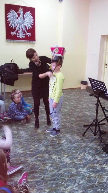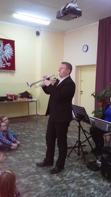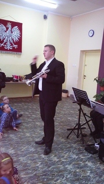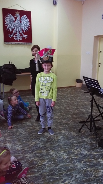 24 listopada drugi raz w tym roku uczestniczyliśmy w lekcji wzbogacającej naszą wiedzę muzyczną. Tym razem nosiła ona tytuł" Z szabelką w ręku i pieśnią na ustach". Celem było utrwalenie wiedzy dotyczącej odzyskania niepodległości przez Polskę oraz postaci Józefa Piłsudskiego. Śpiewano pieśni patriotyczne, uczniowie uczestniczyli w zabawach rytmicznych oraz bliżej poznali cechy charakterystyczne i dźwięk trąbki.