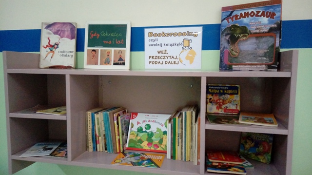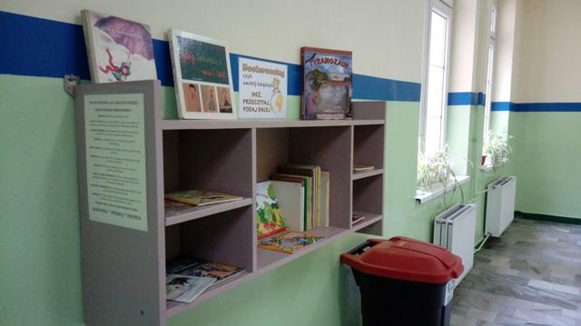 W akcji bookcrosingowej w Kąciku Ciszy na II piętrze oraz obok sali „Radosna Szkoła” na piętrze I zawisły półki z książkami i czasopismami.