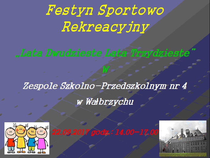 ZSP nr 4 w Wałbrzychu zaprasza całą społeczność szkolną na Festyn Sportowo-Rekreacyjny dnia 22.09.2017 w godz: 14.00 – 17.00 W programie między innymi: III Turniej Piłkarski o Memoriał Michela Nykiela,/ od godz.12.00/ otwarcie Placu Zabaw, rodzinne konkurencje sportowo – rekreacyjne, konkursy wokalne, malowania potretów, zabawy na zamku dmuchanym, pokazy starych samochodów i futbolu amerykańskiego , poczęstunek Gwarantujemy dobrą zabawę i atrakcyjne nagrody.
