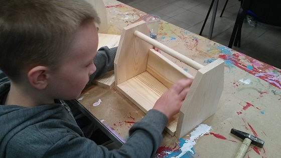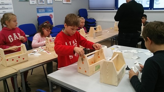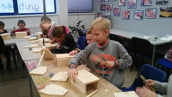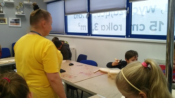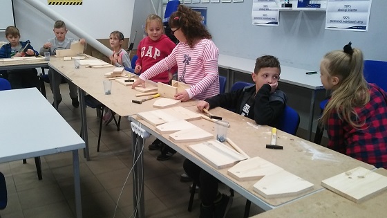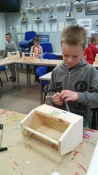 Uczniowie klasy III a i III b uczestniczyli w zajęciach "Majsterkowo" organizowanych przez Castoramę. Dzieci poszerzyły swoje wiadomości związane z obróbką drewna i pracą tartaku - obejrzały film edukacyjny "Od drzewa do deski", a następnie same wykonywały skrzynkę na narzędzia, którą dekorowały według własnego pomysłu. Wielką niespodzianką było to, że bez większych oporów uczniowie brali młotek, gwoździe i z wielką pasją wbijali gwoździe w zaznaczone miejsca desek. Ile było radości w tym, że coś z tego wbijania, łączenia elementów powstaje. Bardzo dziękujemy organizatorom zajęć za wspaniały pomysł rozwijania praktycznych zdolności dzieci oraz pani Anetce i mamie Martyny Boguszewskiej za umożliwienie nam udziału w tych zajęciach.