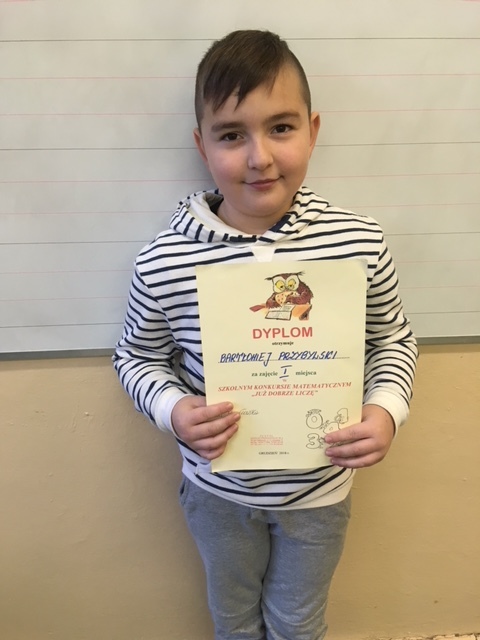 Bartłomiej Przybylski zajął pierwsze miejsce w szkolnym konkursie matematycznym pn. „JJuż dobrze liczę”.