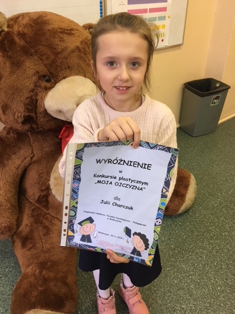 Julia Charczuk otrzymała wyróżnienie w miejskim konkursie pn.”Moja Ojczyzna” organizowanym przez Poradnię Psychologiczno-Pedagogiczną w Wałbrzychu.