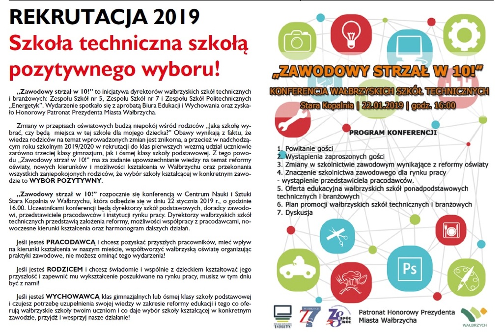 Edukacji i Wychowania oraz dyrektorzy wałbrzyskich szkół technicznych i branżowych: Zespołu Szkół Nr 5, Zespołu Szkół Nr 7 i Zespołu Szkół Politechnicznych „Energetyk”, zapraszają na konferencję pt. „Zawodowy strzał w 10 !”, która odbędzie się w dniu 22 stycznia 2019 r., o godzinie 16.00 w Starej Kopalni Centrum Nauki i Sztuki w Wałbrzychu. Podczas spotkania zaproszeni goście zapoznają się ze zmianami dotyczącymi szkolnictwa zawodowego, ofertą edukacyjną ww. szkół ponadpodstawowych i opiniami pracodawców na temat znaczenia szkolnictwa zawodowego dla współczesnego rynku pracy. Konferencja ma charakter otwarty i mile widziani będą również rodzice .