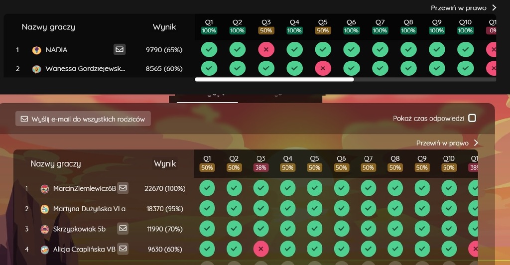 Wyniki szkolnego konkursu wiedzy online Quizziz