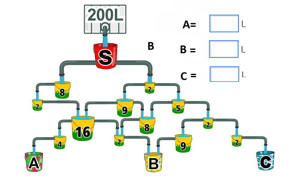 Jaka ilość wody znajdzie się w pojemniku A , B , C w poniższym systemie po wlaniu u góry 200 litrów wody?