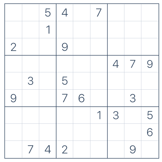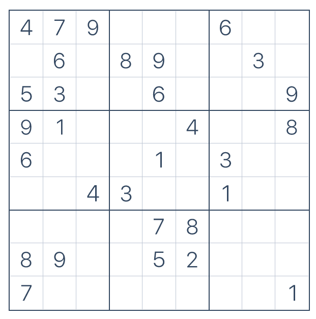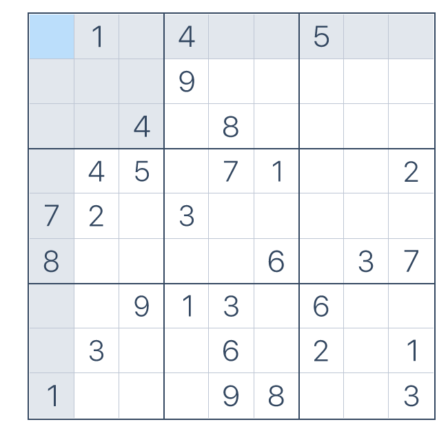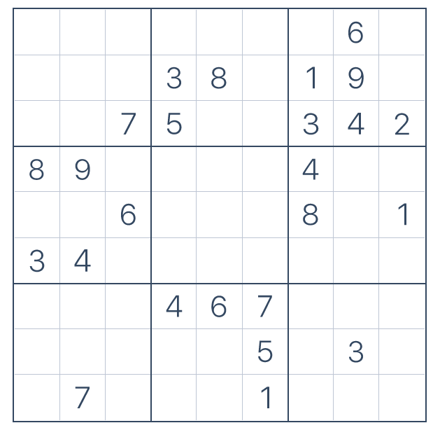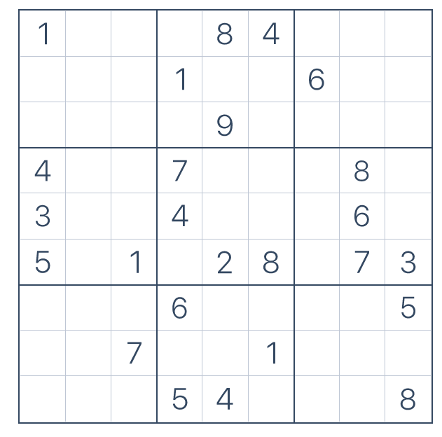 Sudoku to łamigłówka, której celem jest wypełnienie diagramu 9 × 9 w taki sposób, aby w każdym wierszu, w każdej kolumnie i w każdym z dziewięciu pogrubionych kwadratów 3 × 3 znalazło się po jednej cyfrze od 1 do 9.