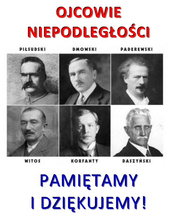 Polska niepodległość ma wielu ojców. Wskazanie tylko kilku z grona najbardziej zasłużonych w tym czasie osób jest uproszczeniem, jednak nie sposób tu wymienić wszystkich patriotów, którzy przyczynili się do odzyskania należne go nam miejsca na mapie politycznej Europy. W szczególny sposób w walce o niepodległość naszej ojczyzny wyróżniają się dokonania Józefa Piłsudskiego, Romana Dmowskiego, Ignacego Jana Paderewskiego, Wincentego Witosa, Wojciecha Korfantego i Ignacego Daszyńskiego. Ich zaangażowanie na frontach I wojny światowej, działalność dyplomatyczna, polityczna i społeczna doprowadziły do powstania II Rzeczypospolitej.