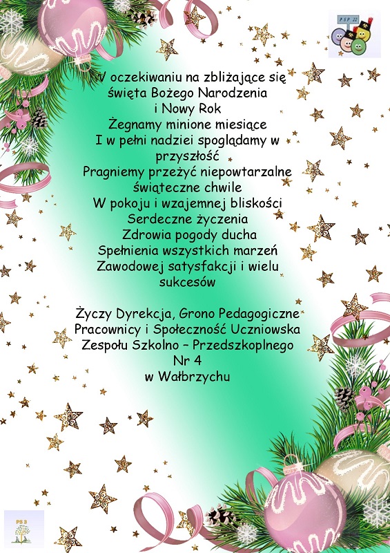 W czasie Pandemii nie ma wigilii klasowych dlatego też można przesłać życzenia nauczycielom, uczniom za pośrednictwem http://zsp4walbrzych.pl oraz fanpage ZSP 4