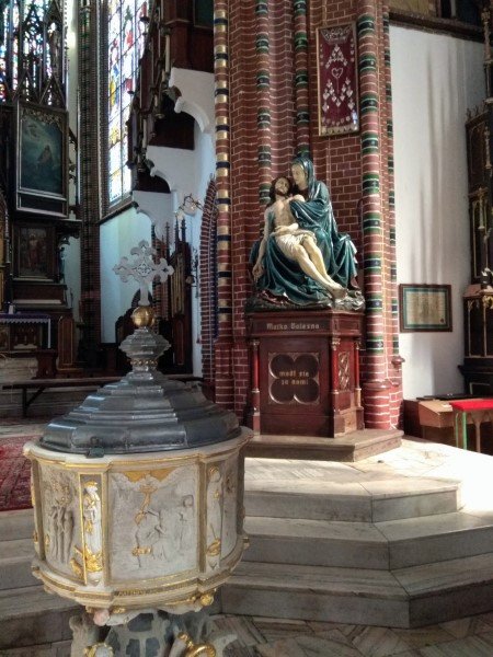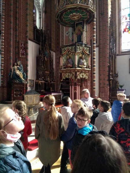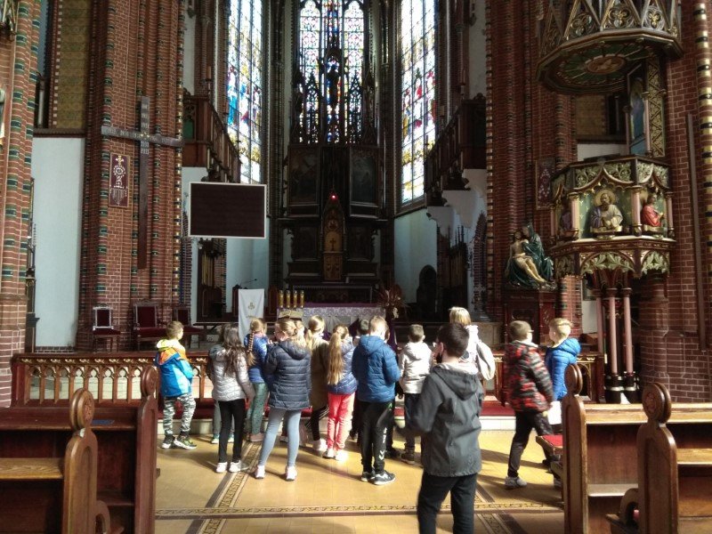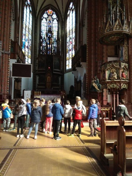 Po zakończeniu zajęć przeszliśmy do Sanktuarium Matki Boskiej Bolesnej na Placu Kościelnym, obejrzeliśmy Pomnik Niepodległości, przy którym odbywają się uroczystości. Kolejnym punktem wycieczki była Kolegiata Pw. NMP Bolesnej i Św. Aniołów Stróżów. Pani Joanna Kowalska pięknie opowiedziała o witrażach, ambonie oraz organach.