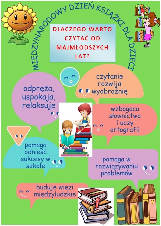 Czytanie książek pobudza wyobraźnię, ułatwia komunikację, wzbogaca słownictwo, zwiększa wrażliwość i wiedzę ogólną, a przede wszystkim - uczy myślenia. Dzieci, które lubią czytać dla przyjemności są kreatywne i tolerancyjne, pięknie się wypowiadają, posiadają dużą wiedzę o otaczającym świecie, a co za tym idzie - z dużą swobodą piszą wypracowania. Zalet czytania jest całe mnóstwo, więc serdecznie zachęcamy do sięgania po książki zawsze i wszędzie.