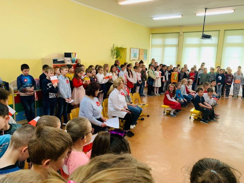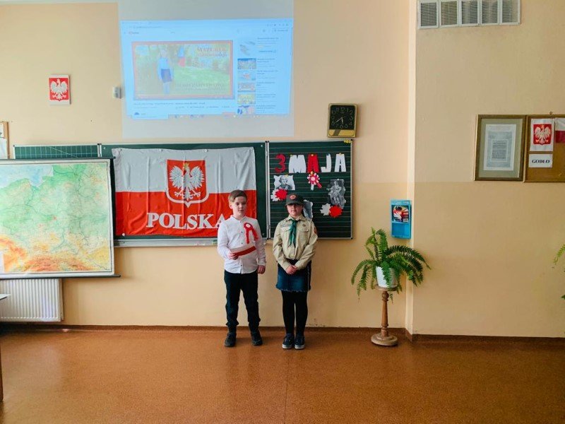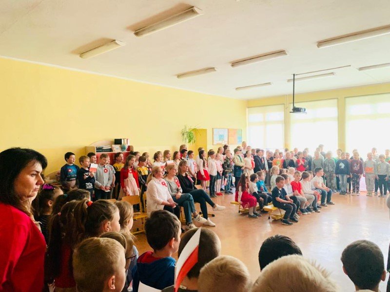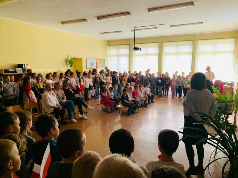29 kwietnia 22 r. klasy I-III uczestniczyły w patriotycznej uroczystości z okazji Konstytucji 3 Maja. Wszyscy byłi w galowych strojach, a sala przybrała biało-czerwony kolor. Scenariusz przygotowały klasy trzecie z wychowawcami. Uroczystość zaszczycili goście: pani wicedyrektor, pedagog szkolny, Pani Joanna Kowalska, Elżbieta Wołczacka- Wilczewska. nauczyciele klas I-III. Gościliśmy dzieci z zerówki z nauczycielem - panią Dorotą Szmyd. Spotkanie miało charakter patriotyczny, nastrój był uroczysty i podniosły.