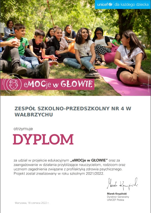 ZSP NR 4 w Wałbrzychu w roku szkolnym 2021/22 uzyskał dyplom za realizację projektu UNICEF 'eMOCje w GŁOWIE' . Adresatami projektu byli uczniowie, nauczyciele i rodzice.