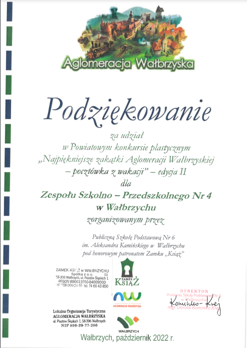 Publiczna Szkoła Podstawowa NR 6 dziękuje naszej szkole za udział w konkursie plastycznym "Najpiękniejsze zakątki Aglomeracji Wałbrzyskiej'