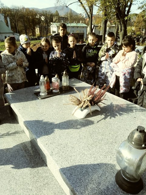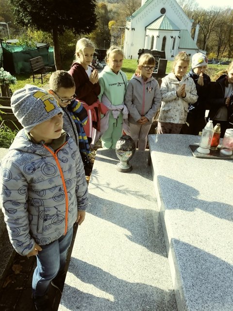 Klasa 2 a uczestnicząc w akcji "Szkoła Pamięta"udała się ze zniczami na pobliski cmentarz odwiedzając groby Julii, Grażynki i pani Danuty Dyl - wieloletniego pedagoga i wicedyrektora naszej szkoły. Dzieci z zainteresowaniem i zadumą słuchały historii odejścia tych osób.