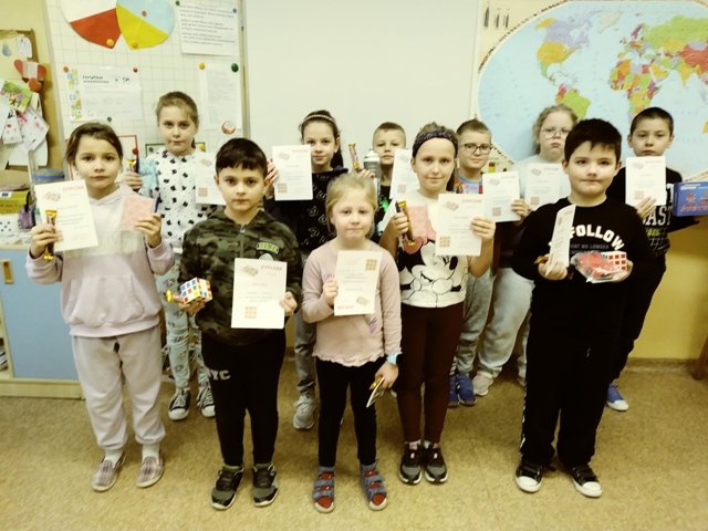 W naszej klasie gościliśmy również laureatów konkursu gry w "Kółko i krzyżyk". Oto oni: 1 miejsce - Zofia Stępień, Oskar Weber i Blanka Kindel. 2 miejsce - Michał Rajkowski, Michał Gezela, Alan Skading. 3 miejsce - Bartosz Grodzicki, Lena Jaworska, Zuzanna Kempa. Wyróżnienie - Natalia Malawka, Jakub Wilk, Natalia Trześniak. Serdecznie gratulujemy.