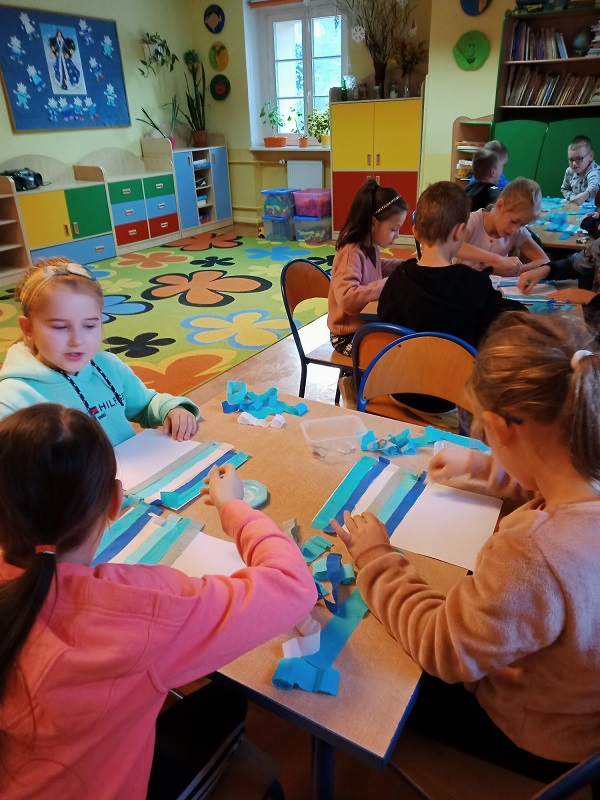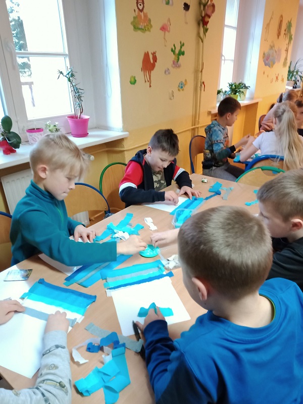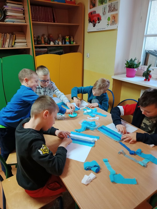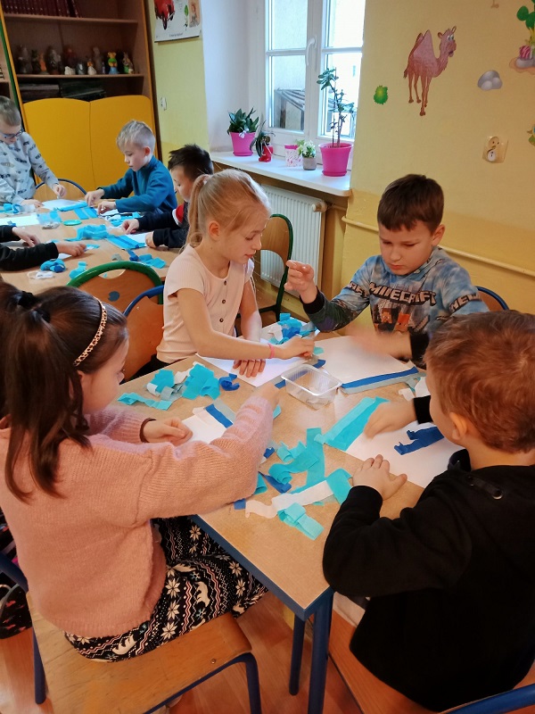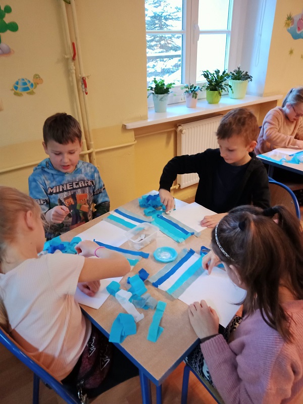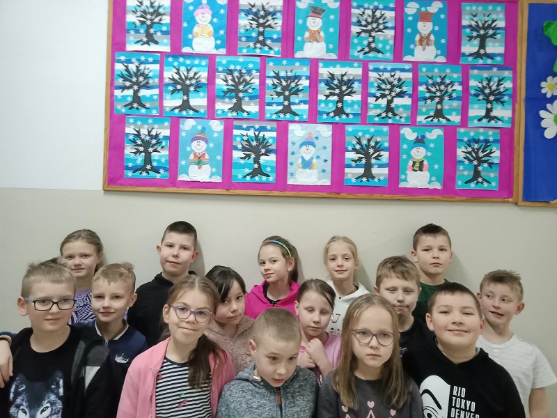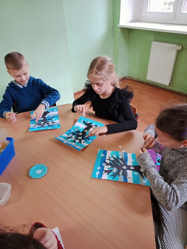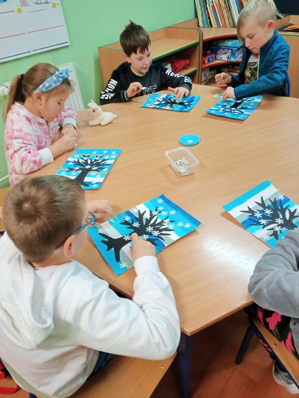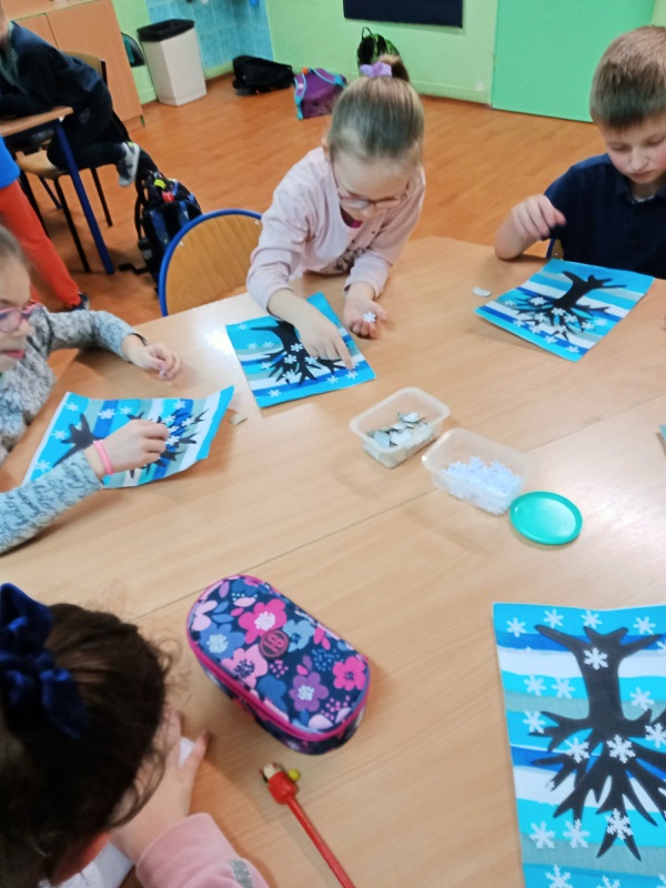 Nadszedł czas na „Zimowe drzewa”. Była to praca wieloetapowa i czasochłonna, ale gotowe prace bardzo nas cieszą. No i chyba mają magiczną moc, bo po ich ukończeniu nasypało nam śniegu. Wreszcie mamy prawdziwą zimę – hura!