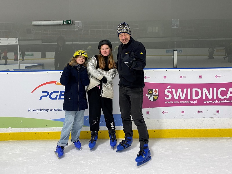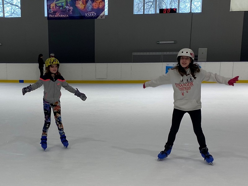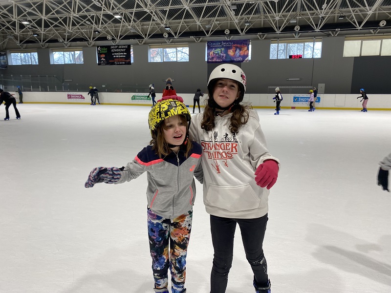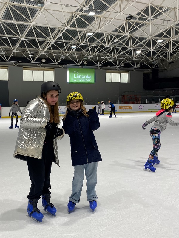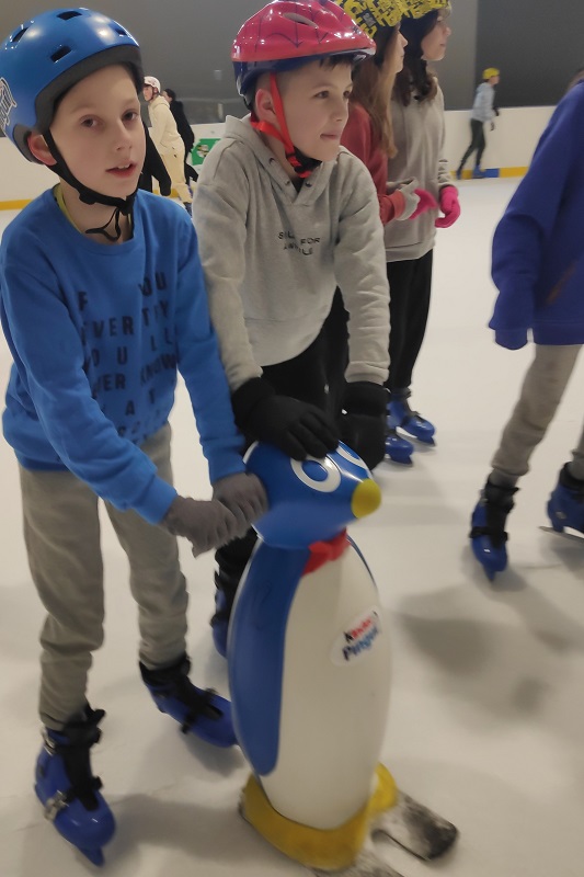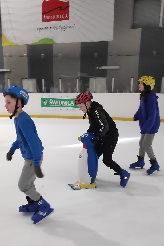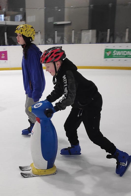 Śmiechu przy tym było co nie miara. Jedni śmigali, „tańczyli na lodowisku”, a inni uczyli się stąpania po lodzie. Niektórzy zamiast ślizgów solowych preferowali towarzystwo sympatycznych pingwinków lub przejażdżkę grupową. Zabawa była wyśmienita tak samo jak i nasze humory. Na lodowisku spędziliśmy dwie godziny obiecując sobie ,że jeszcze tu wrócimy.