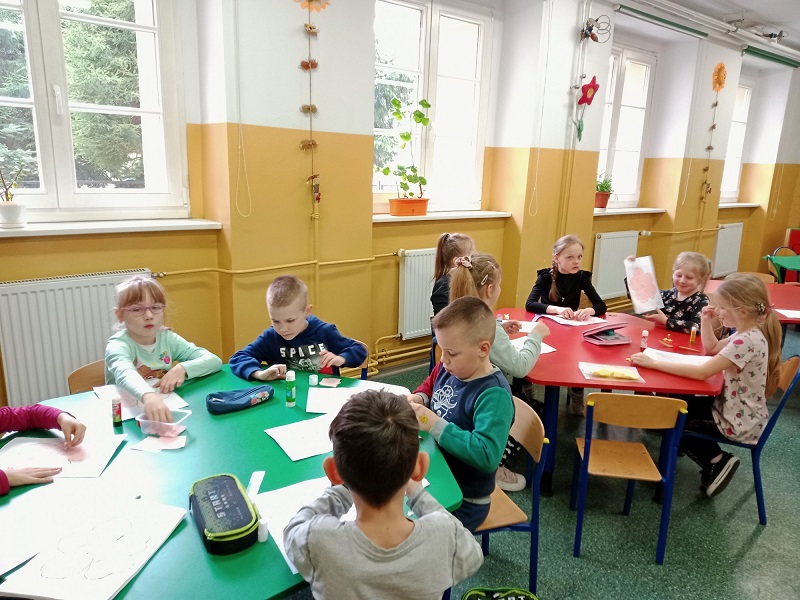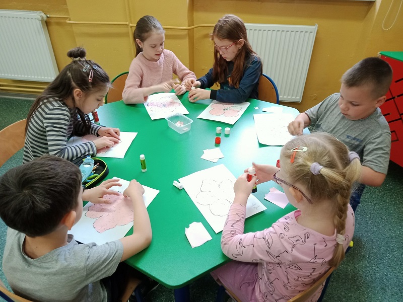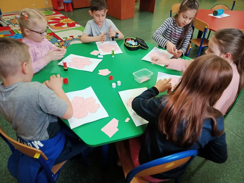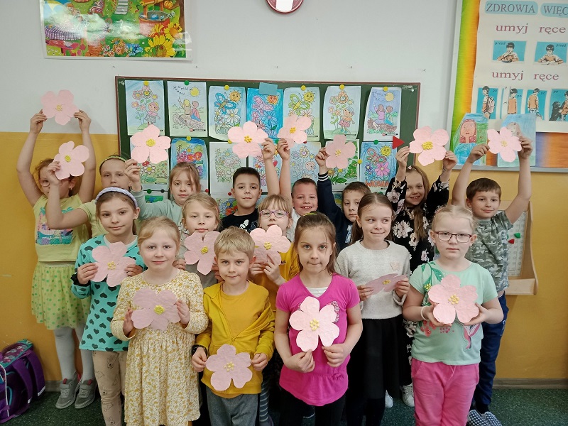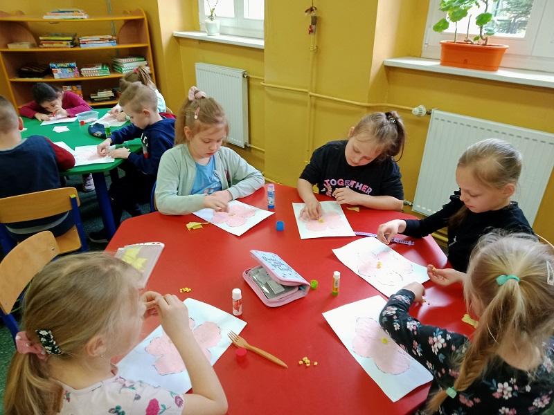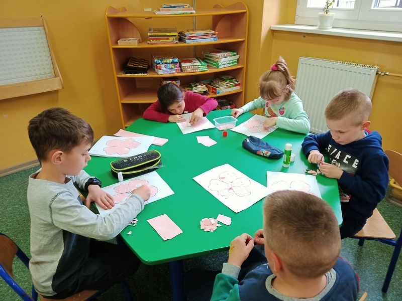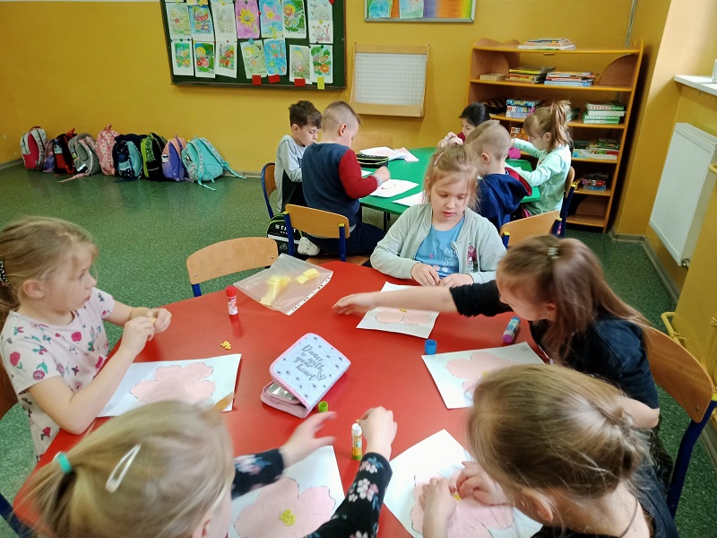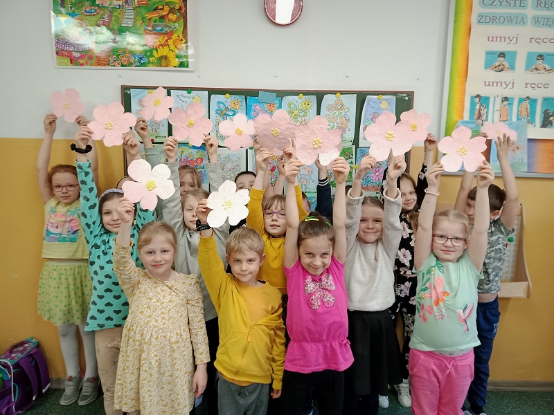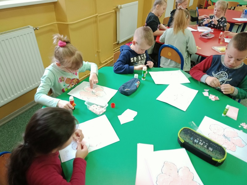 Dlatego też, na świetlicy szkolnej postanowiliśmy zatrzymać ten moment w kolejnej wiosennej pracy plastycznej. Dzieci z klas pierwszych stworzyły piękne, różowe kwiaty wiśni. Praca nad nimi wymagała dokładności, staranności i cierpliwości.