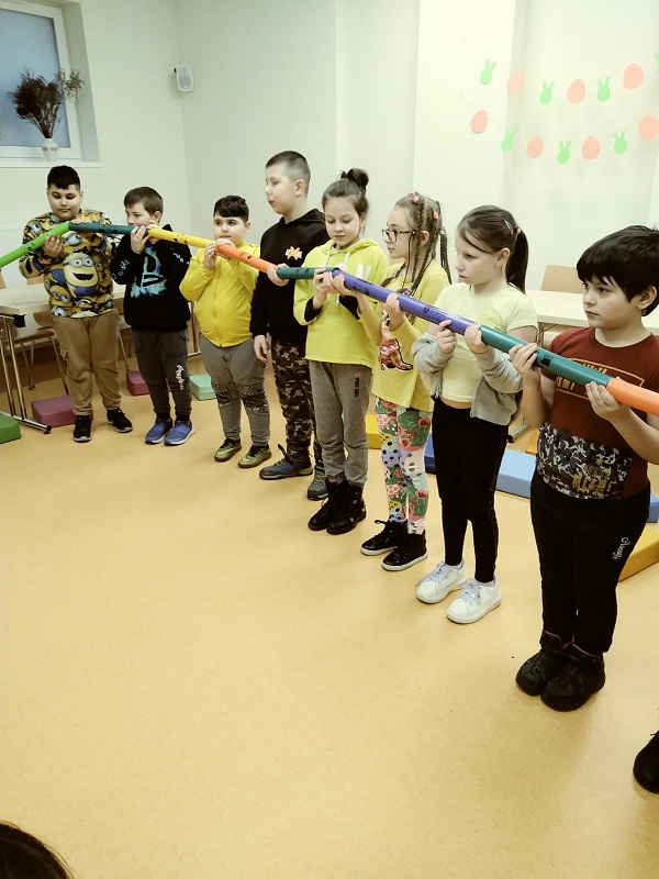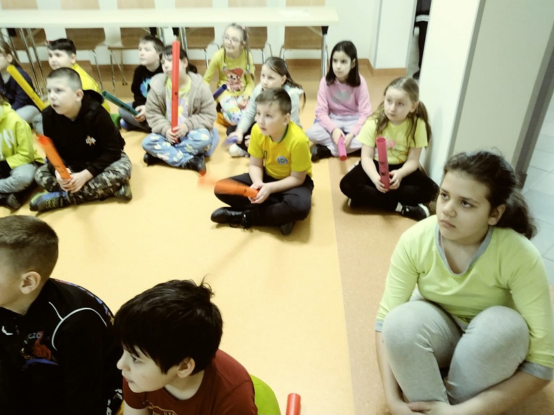 Warsztaty muzyczne " Bum, bum rurki" w Filii nr 1 Biblioteki pod Atlantami. Było głośno i wesoło- klasa 1b i 2a.