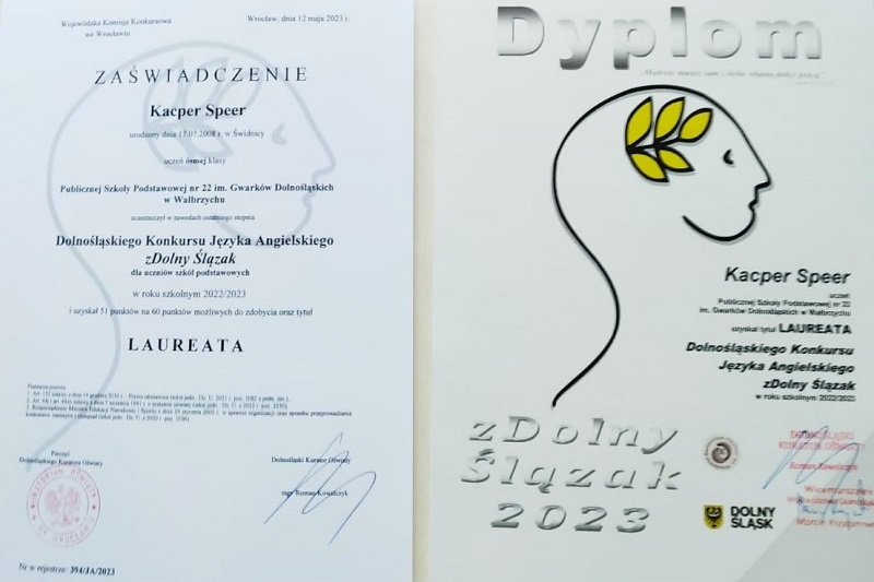 Z ogromną przyjemnością informujemy, że uczeń klasy 8b Kacper Speer został Laureatem Dolnośląskiego Konkursu Zdolny Ślązak z Języka angielskiego. Kacper uzyskał 51 punktów z 60.