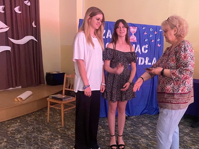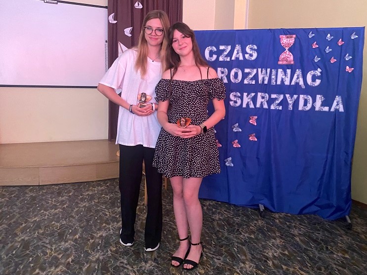 Pani Dyrektor Mariola Rząsowska wręczyła uczennicom Martynie Sztych , Karinie Michalak statuetki za bardzo dobre wyniki w nauce oraz przedstawiła Prymusa Szkoły którym został Kacper Speer.