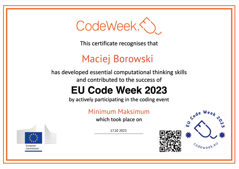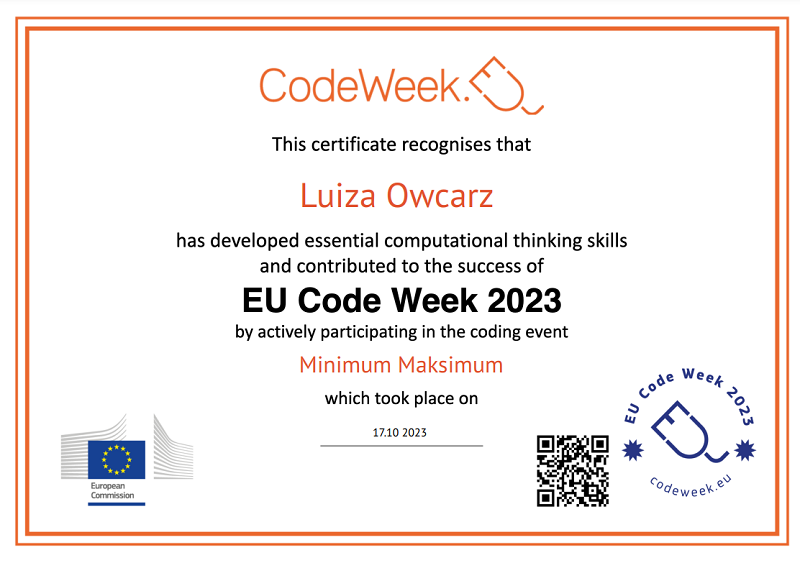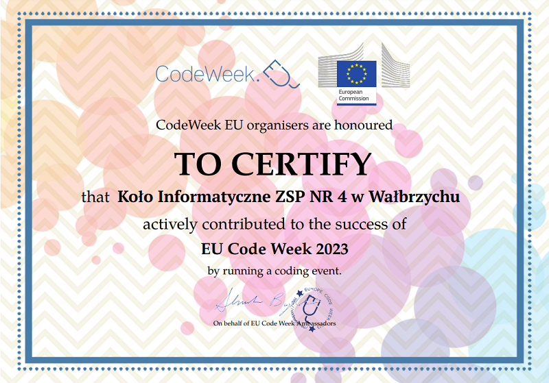 Nasza szkoła, jak już pisaliśmy na łamach naszej strony po raz kolejny brała udział w inicjatywie Code Week – Europejskim Tydzień Kodowania, zdobywając dwa Certyfikaty. Kodowanie odbywało się na lekcjach informatyki oraz kole informatycznym.