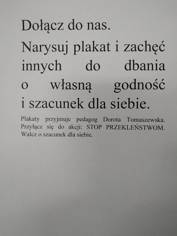 Pani Pedagog Dorota Tomaszewska wraz z Wolontariuszami naszej szkoły zapraszają do wspólnej akcji - kampanii unikania wulgaryzmów. 17.12.2023r., obchodzimy ,,Dzień bez Przekleństw". Zachęcamy całą społeczność szkolną do refleksji nad estetyką wypowiedzi. Kampania będzie trwała do końca stycznia 2024r.