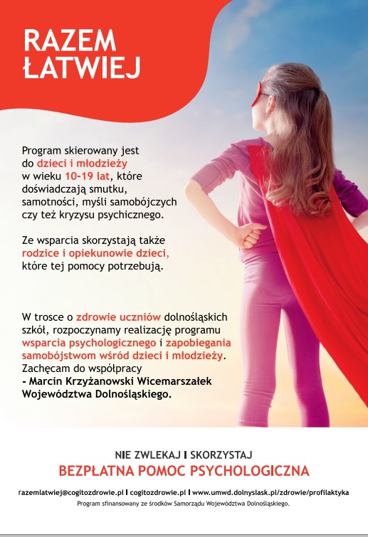 Przystąpiliśmy do programu: Razem Łatwiej . Program został stworzony przez Samorząd Województwa Dolnośląskiego a realizatorem jest firma Cogito posiadająca wykwalifikowaną kadrę.