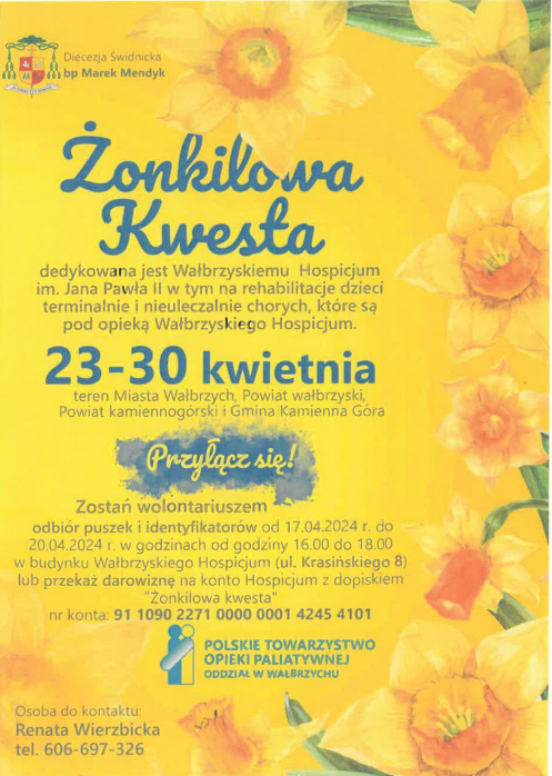 Szanowni Państwo. Serdecznie zapraszamy do wzięcia udziału w ,,Żonkilowej Kweście". Nasi dzielni Wolontariusze będą jak co roku bardzo aktywni w tej szlachetnej akcji. Zapraszamy i Was wszystkich Moi Drodzy. Przyłączcie się . W załączeniu przesyłam plakat ze szczegółami.