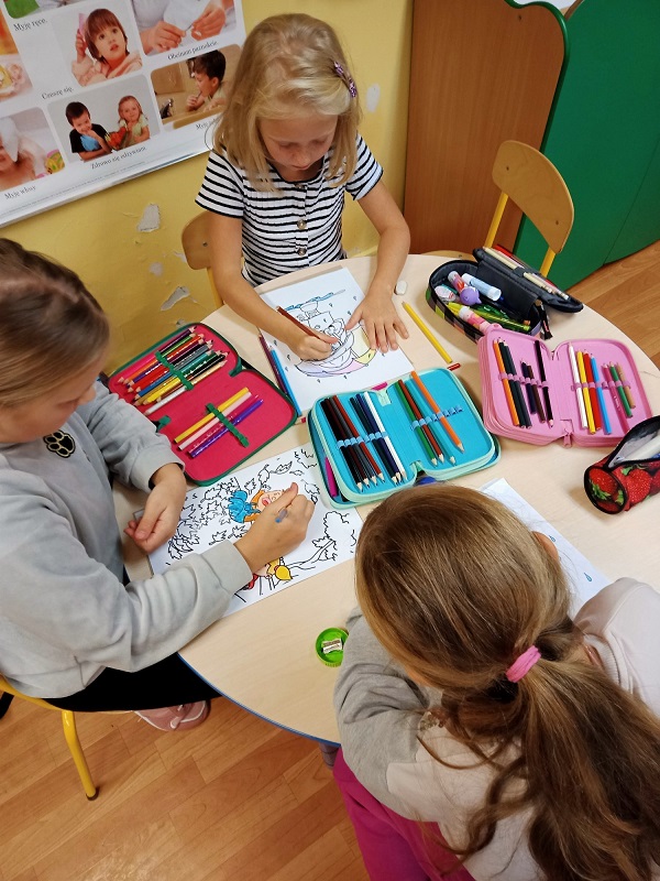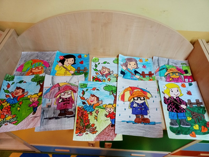 W oparciu o tematyczne kolorowanki zaczynamy pokazywać jesienne zmiany w przyrodzie oraz zwierzęta i ludzi dostosowujących się do nowej pory roku. Ćwiczymy też dokładne i wyraziste kolorowanie.