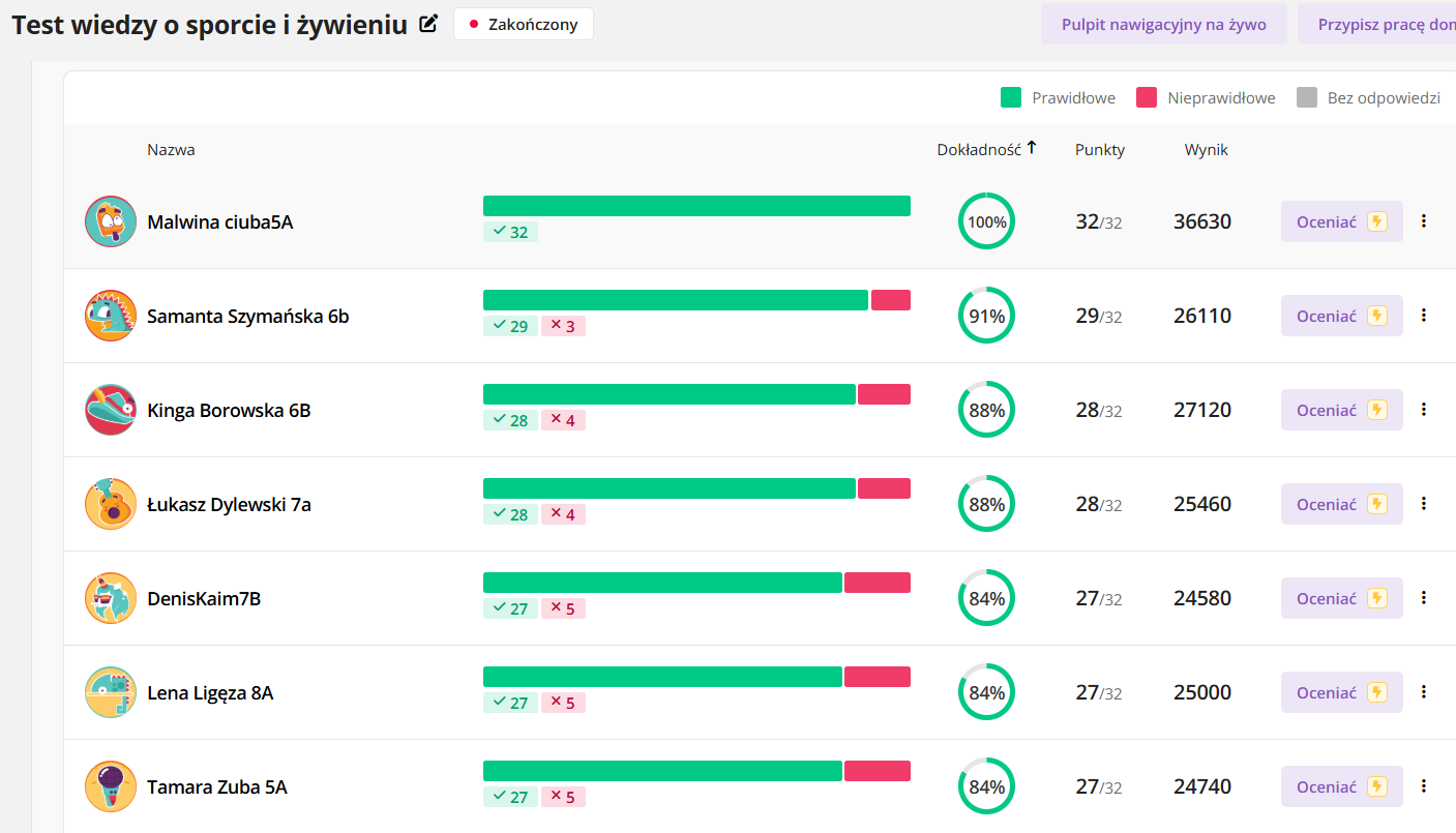 Wyniki Testu wiedzy i zdrowym odżywianiu i sporcie.