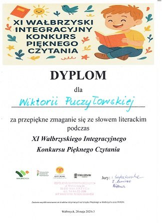 Konkurs ten to doskonała okazja, aby zaprezentować swoje zdolności czytelnicze, wyrazić siebie i pokazać pasję do książek. Reprezentantki naszej szkoły Karolina Piechocka z kl. Ia i Wiktoria Puczyłowska z kl. IVa zaprezentowały fragmenty książek zakupionych z funduszy Narodowego Programu Rozwoju Czytelnictwa. W tym roku komisja konkursowa doceniła zaangażowanie wszystkich uczestników, nagradzając ich dyplomami i upominkami.