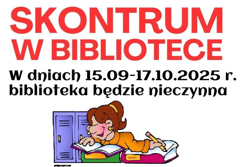 W dniach 15 września -17 października 2025 r. w bibliotece szkolnej zostanie przeprowadzone skontrum zbiorów (inwentaryzacja). W czasie skontrum nie będzie można wypożyczać ani zwracać materiałów bibliotecznych. Za utrudnienia przepraszamy.