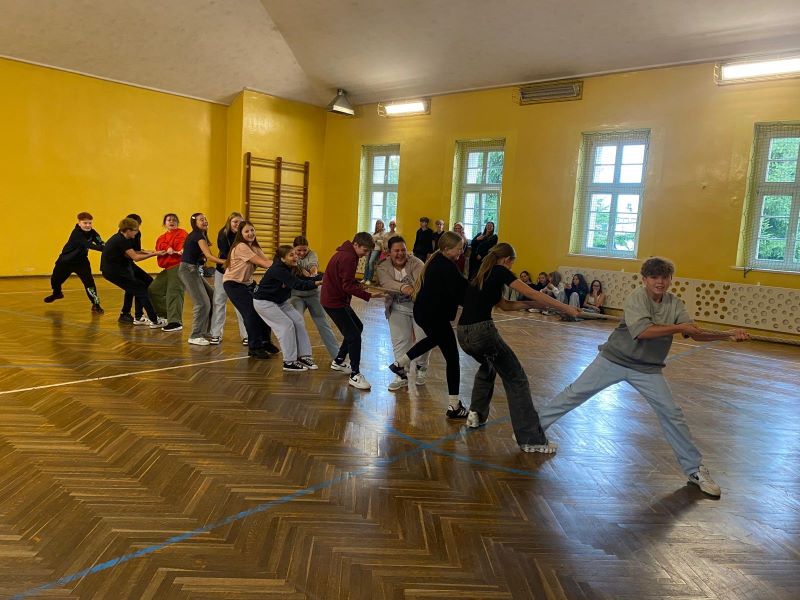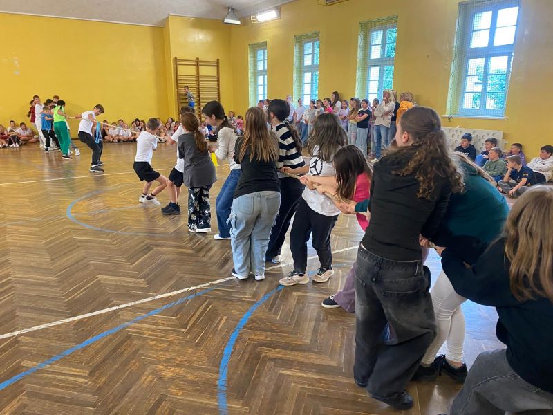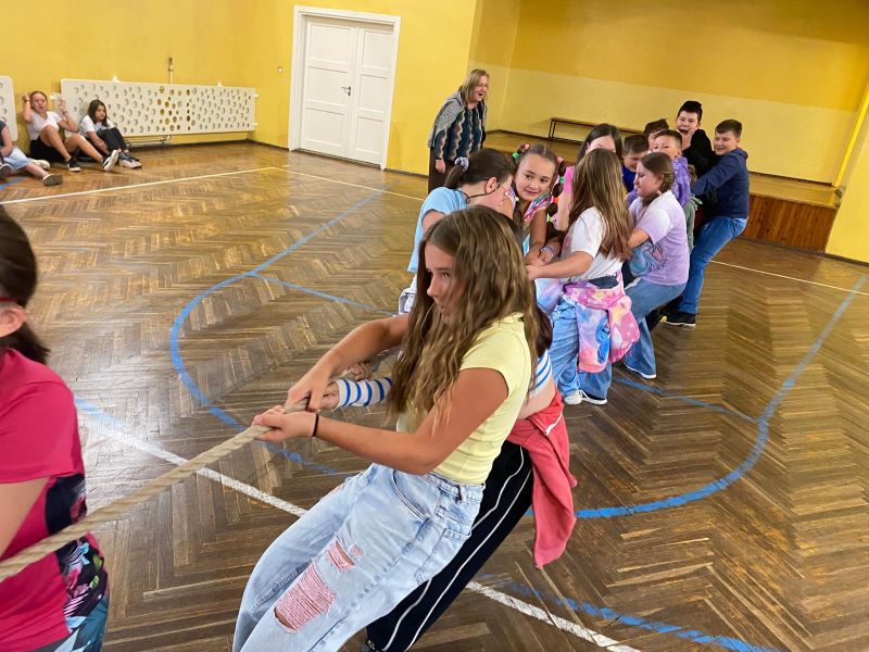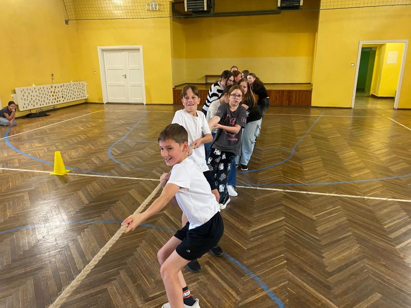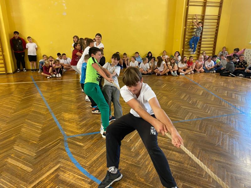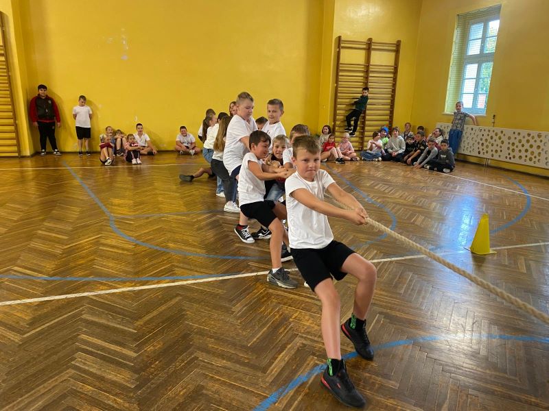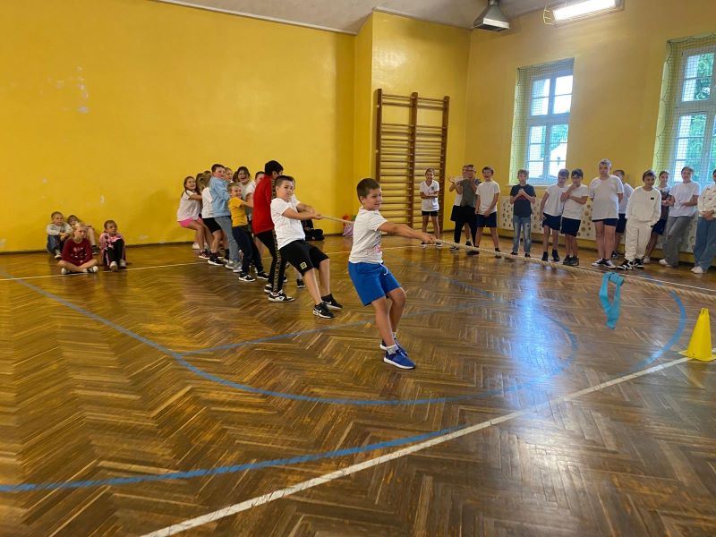 przeciągani liny na poziomach klas. Zwyciężyły klasy IVb, Vb, VIb, VIIb, VIIIb.