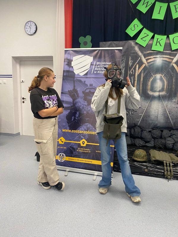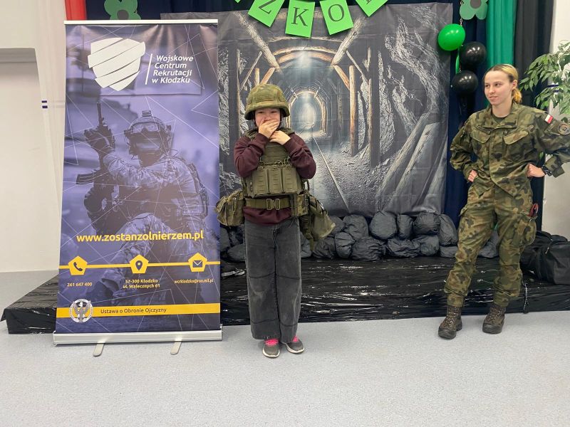 Żołnierze z Centrum Rekrutacji w Kłodzku przybliżyli idee istnienia wojska, sposoby rekrutacji do armii zawodowej. Rodzaje szkół. . Zaprezentowali podstawy musztry oraz sposoby zakładania maski p gaz.