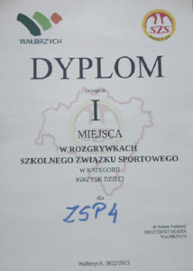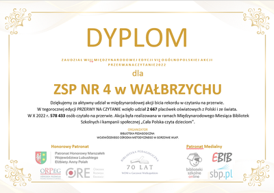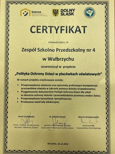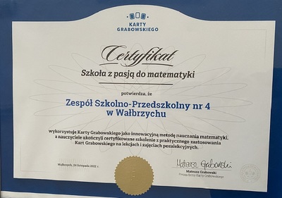 Certyfikat dla ZSP NR 4 w Wałbrzychu.